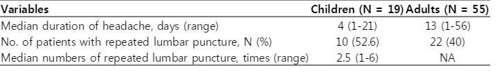 Table 3. Treatment outcomes in children and adult patients with eosinophilic meningitis