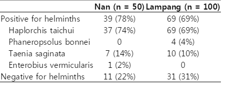 Villagers were selected from Bo Kluea District, Nan Province (n=50), and Chae Hom District, Lampang Province (n=100), northern Thailand. These areas were under Her Royal Highness Princess Maha Chakri Sirindhon's Project for Remote Area Development. Cases with stools previously reported to contain