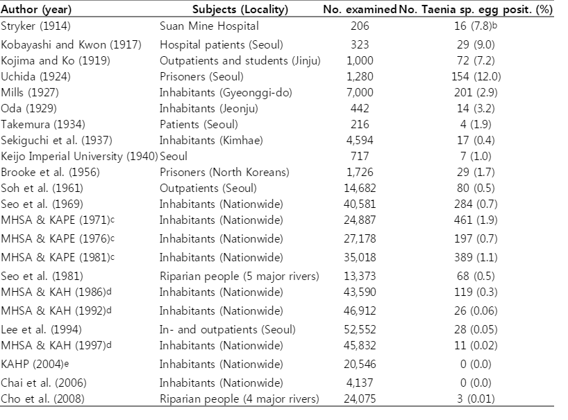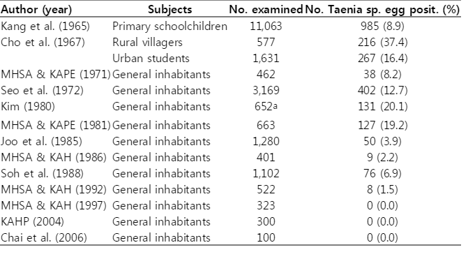 Author (year) Subjects (Locality) No. examined No. Taenia sp. egg posit. (%) Stryker (1914) Suan Mine Hospital 206 16 (7.8)b Kobayashi and Kwon (1917) Hospital patients (Seoul) 323 29 (9.0) Kojima and Ko (1919) Outpatients and students (Jinju) 1,000 72 (7.2) Uchida (1924) Prisoners (Seoul) 1,280 154 (12.0) Mills (1927) Inhabitants (Gyeonggi-do) 7,000 201 (2.9) Oda (1929) Inhabitants (Jeonju) 442 14 (3.2) Takemura (1934) Patients (Seoul) 216 4 (1.9) Sekiguchi et al. (1937) Inhabitants (Kimhae) 4,594 17 (0.4) Keijo Imperial University (1940) Seoul 717 7 (1.0) Brooke et al. (1956) Prisoners (North Koreans) 1,726 29 (1.7) Soh et al. (1961) Outpatients (Seoul) 14,682 80 (0.5) Seo et al. (1969) Inhabitants (Nationwide) 40,581 284 (0.7) MHSA & KAPE (1971)c Inhabitants (Nationwide) 24,887 461 (1.9) MHSA & KAPE (1976)c Inhabitants (Nationwide) 27,178 197 (0.7) MHSA & KAPE (1981)c Inhabitants (Nationwide) 35,018 389 (1.1) Seo et al. (1981) Riparian people (5 major rivers) 13,373 68 (0.5) MHSA & KAH (1986)d Inhabitants (Nationwide) 43,590 119 (0.3) MHSA & KAH (1992)d Inhabitants (Nationwide) 46,912 26 (0.06) Lee et al. (1994) In- and outpatients (Seoul) 52,552 28 (0.05) MHSA & KAH (1997)d Inhabitants (Nationwide) 45,832 11 (0.02) KAHP (2004)e Inhabitants (Nationwide) 20,546 0 (0.0) Chai et al. (2006) Inhabitants (Nationwide) 4,137 0 (0.0) Cho et al. (2008) Riparian people (4 major rivers) 24,075 3 (0.01) Author (year) Subjects No. examined No. Taenia sp. egg posit. (%) Kang et al. (1965) Primary schoolchildren 11,063 985 (8.9) Cho et al. (1967) Rural villagers 577 216 (37.4) Urban students 1,631 267 (16.4) MHSA & KAPE (1971) General inhabitants 462 38 (8.2) Seo et al. (1972) General inhabitants 3,169 402 (12.7) Kim (1980) General inhabitants 652a 131 (20.1) MHSA & KAPE (1981) General inhabitants 663 127 (19.2) Joo et al. (1985) General inhabitants 1,280 50 (3.9) MHSA & KAH (1986) General inhabitants 401 9 (2.2) Soh et al. (1988) General inhabitants 1,102 76 (6.9) MHSA & KAH (1992) General inhabitants 522 8 (1.5) MHSA & KAH (1997) General inhabitants 323 0 (0.0) KAHP (2004) General inhabitants 300 0 (0.0) Chai et al. (2006) General inhabitants 100 0 (0.0)