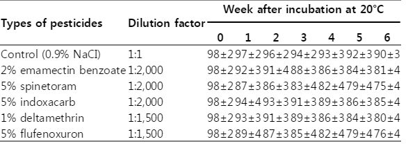 0 1 2 3 4 5 6 Control (0.9% NaCI) 1:1 98±2 97±2 96±2 94±2 93±3 92±3 90±3 2% emamectin benzoate 1:2,000 98±2 92±3 91±4 88±3 86±3 84±3 81±4 5% spinetoram 1:2,000 98±2 87±3 86±3 83±4 82±4 79±4 75±4 5% indoxacarb 1:2,000 98±2 94±4 93±3 91±3 89±3 86±3 85±4 1% deltamethrin 1:1,500 98±2 93±3 91±3 89±3 86±3 84±3 80±4 5% flufenoxuron 1:1,500 98±2 89±4 87±3 85±4 82±4 79±4 76±4