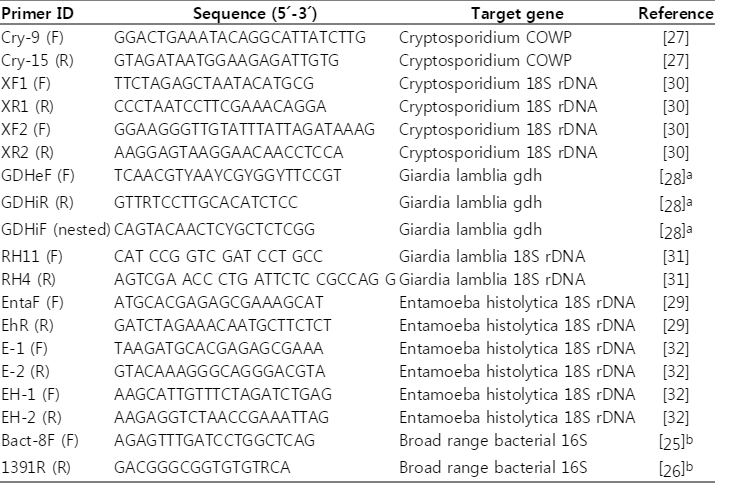 - 32. Khairnar K, Parija SC. A novel nested multiplex polymerase chain reaction (PCR) assay for differential detection of Entamoeba histolytica, E. moshkovskii and E. dispar DNA in stool samples. BMC Microbiol 2007;7:47.