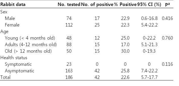 Comparison of the infection rate by sex showed that 17/74 (22.9%) in male and 25/112 (22.3%) in female were seropositive, and all seropositive samples were collected from clinically normal rabbits (