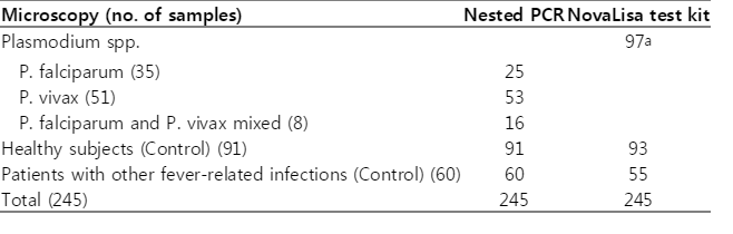 Microscopy (no. of samples) Nested PCR NovaLisa test kit Plasmodium spp. 97aP. falciparum (35) 25  P. vivax (51) 53  P. falciparum and P. vivax mixed (8) 16 Healthy subjects (Control) (91) 91 93 Patients with other fever-related infections (Control) (60) 60 55 Total (245) 245 245 Nested-PCR