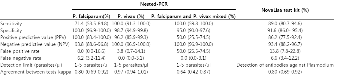 The sensitivity and specificity of nested PCR compared with the microscopic method for detection of P. falciparum, P. vivax, and P. falciparum/P. vivax mixed infection were 71.4 vs 100%, 100 vs 98.7%, and 100 vs 95.0%, respectively. The sensitivity and specificity of ELISA-based NovaLisa test kit compared with the microscopic method for detection of the Plasmodium genus were 89.0% and 91.6%, respectively. The detection limit of all methods for detecting the Plasmodium genus, either for each species, mixed infection/all species (for NovaLisa test kit) was 1-5 parasites/µl. The strength of agreement between nested-PCR and microscopic method for detection of P. vivax was categorized as almost perfect correlation with a kappa value of 0.97. The strength of agreement between both methods for detection of P. falciparum and P. falciparum/P. vivax mixed infection was categorized as substantial correlation with kappa values of 0.80 and 0.64, respectively. For ELISA-based NovaLisa test kit, agreement with microscopic results in detecting the Plasmodium genus was also categorized as substantial correlation with a kappa value of 0.80.