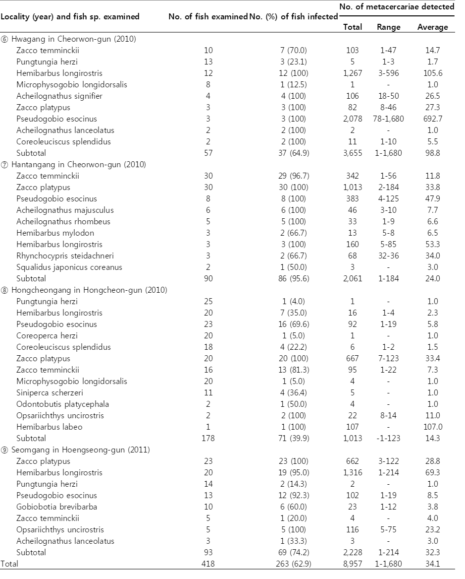 Table 10.Infection status of Centrocestus armatus metacercariae in fish from rivers in Gangwon-do, Korea (2010-2012)