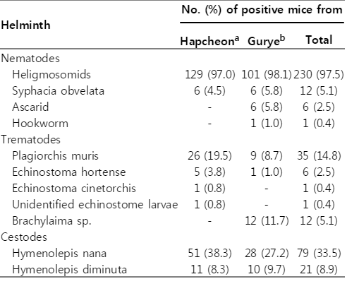Table 3.Quantitative results of heligmosomids recovery in Apodemus agrarius from Gurye-gun, Jeollanam-do, Korea