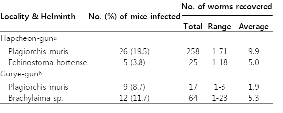 Table 4.Quantitative results of trematode recovery in Apodemus agrarius from Hapcheon-gun, Gyeongsangnam-do and Gurye-gun, Jeollanam-do, Korea