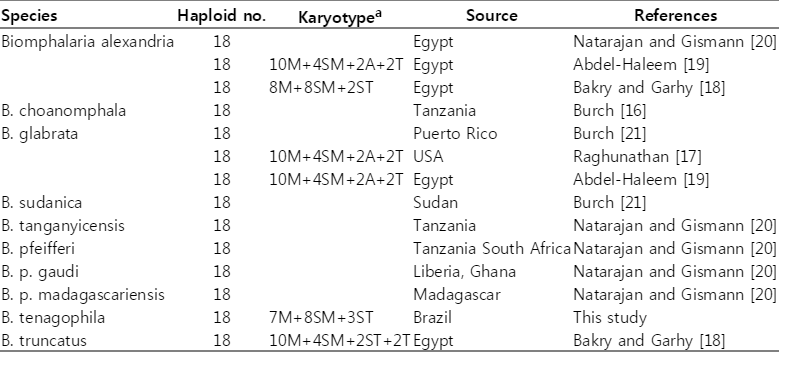 Table 1.Chromosome numbers and karyotypes of subfamily Biomphalarinae