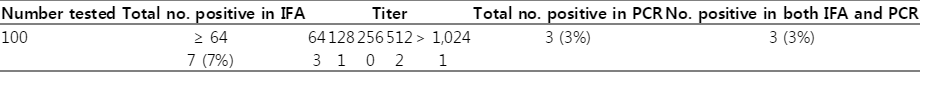 Table 1). The PCR-positive samples had IFA titers of both 512 and 1,024. Sequencing results showed that all PCR-positive samples were similar to