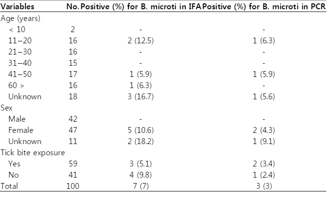 Table 2.Positive rate of B. microti in IFA and PCR according to age, gender, and tick bite exposure