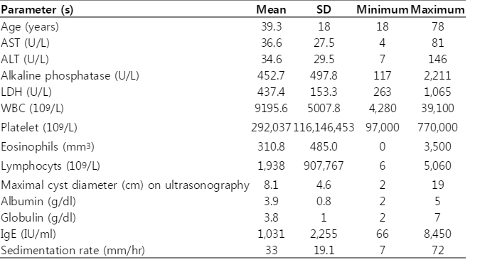This retrospective study consisted of 94 adult patients with active hydatid disease followed up at our gastroenterology clinic from January 2010 to December 2012. The control group consisted of 500 patients (300 men and 200 women) referred to the internal medicine clinics due to other reasons. The diagnosis of CHD of the liver was undertaken using the hydatid cyst ELISA method. An antibody titer higher than 1:160 was considered positive. The serum samples from CHD patients and the control subjects were screened for hepatitis B antigen by ELISA system (Ridascreen®, Echinococcus IgG, R-Biopharm, Darmstadt, Germany) and HBsAgII Cobas (Roche, Mannheim, Germany) at the time of initial diagnosis.