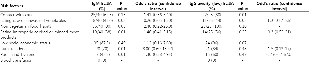 Table 2.Distribution of risk factors in patients for Toxoplasma IgM ELISA and low avidity IgG antibodies