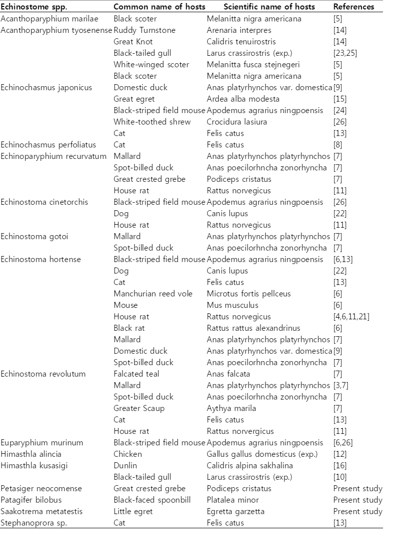 Echinostomes of birds have been investigated only in a few avian species in Korea. Total 8 species, i.e., A. marilae, A. tyosenense, E. japonicus, E. recurvatum, E. gotoi, E. miyagawai, E. revolutum, and H. kusasigi, have been reported as the avian echinostomes. Their hosts were recorded as follows: A. marilae from the black scoter, A. tyosenense from the ruddy turnstone, great knot, black-tailed gull, white-winged scoter, and black scoter, E. japonicus from the domestic duck and great egret, E. recurvatum from the mallard, spot-billed duck, and great crested grebe, E. gotoi from the mallard and spot-billed duck, E. miyagawai from the mallard, domestic duck, and spot-billed duck, E. revolutum from the falcated teal, mallard, spot-billed duck, and great scaup and H. kusasigi from the dulin [3,5,7,9,14,15,16].