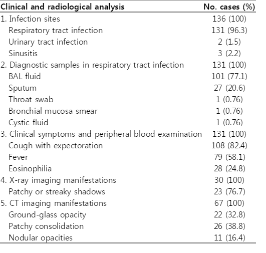 Table 2.Review of clinical and radiological analysis of 136 cases of Lophomonas blattarum infection (1993-2013)