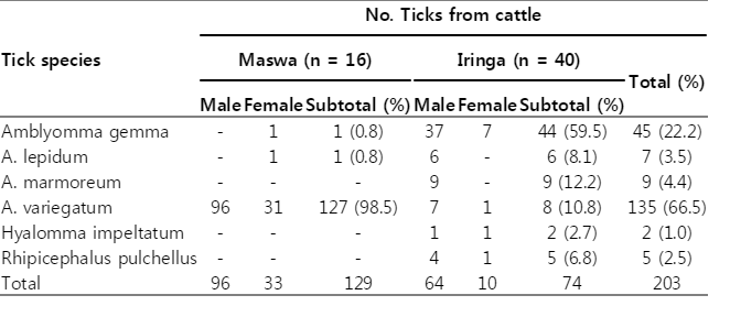 A. gemma were the predominant tick species in cattle of the Maswa district and Iringa urban, respectively. Of the