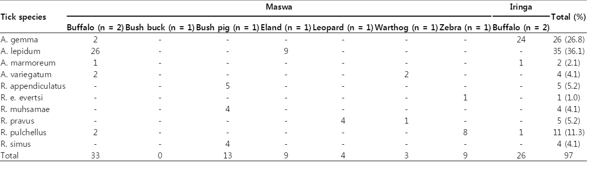 Ticks and tick-borne diseases are important in human and livestock health worldwide. In November 2012, ixodid ticks were collected and identified morphologically from cattle and wild animals in the Maswa district and Iringa urban, Tanzania. Amblyomma gemma, A. lepidum, and A. variegatum were identified from Maswa cattle, and A. variegatum was the predominant species. A. marmoreum, Hyalomma impeltatum, and Rhipicephalus pulchellus were identified from Iringa cattle in addition to the above 3 Amblyomma species, and A. gemma was the most abundant species. Total 4 Amblyomma and 6 Rhipicephalus species were identified from wild animals of the 2 areas. A. lepidum was predominant in Maswa buffaloes, whereas A. gemma was predominant in Iringa buffaloes. Overall, A. variegatum in cattle was predominant in the Maswa district and A. gemma was predominant in Iringa, Tanzania.