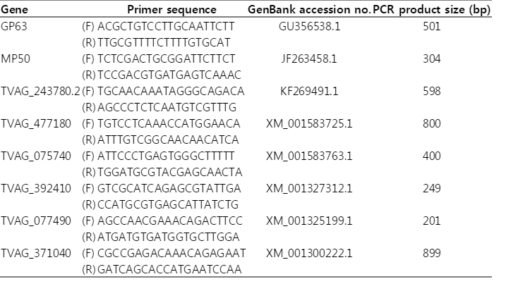 T. vaginalis T016 isolate using Trizol Reagent (Invitrogen, Carlsbad, California, USA), and RNA concentrations were determined spectrophotometrically. RNA (1 µg) was reverse transcribed using the ReverTra Ace RT kit (Toyobo, Osaka, Japan). Following reverse transcription, cDNA was amplified by PCR using Ex Taq (Takara, Tokyo, Japan) under the following conditions: 5 min at 94℃, followed by 30 cycles of 30 sec at 98℃, 30 sec at 57℃, and 1 min at 72℃. The final elongation step was continued for 10 min at 72℃. The primer sequences were used as follows: GP63, MG aminopeptidase P-like metallopeptidase (MP50), M41 FtsH endopeptidase-like metallopeptidase (TVAG_243780.2), oligopeptidase A-like metallopeptidase (TVAG_477180), zinc carboxypeptidase-like metallopeptidase (TVAG_075740), and aspartyl aminopeptidase-like metallopeptidase (TVAG_392410) (