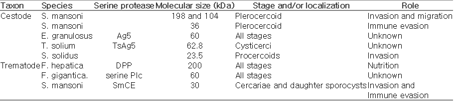 Sparganosis caused by the plerocercoid larvae of Spirometra mansoni usually results from ingesting contaminated food or water. The parasite can migrate to any part of the body, but it usually resides in the skin where it develops into a nodule. Kong et al. [30] purified 3 neutral serine proteases from the extracts of the plerocercoids. Analysis of proteolytic activities showed that 2 trypsin-like proteases of 198 and 104 kDa have collagenolytic activities; however, the 36 kDa chymotrypsin-like serine protease prefers to cleave human recombinant interferon-g and bovine myelin basic protein. In addition, all purified proteins elicited strong antibody responses in infected patients, suggesting that they could be potential antigens in serologic diagnosis of human sparganosis [30].