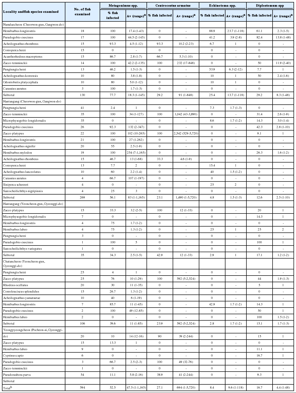Table 4.Infection status of Stephanoprora spp. metacercariae in fishes from the water systems of Hantangang and Imjingang in Korea