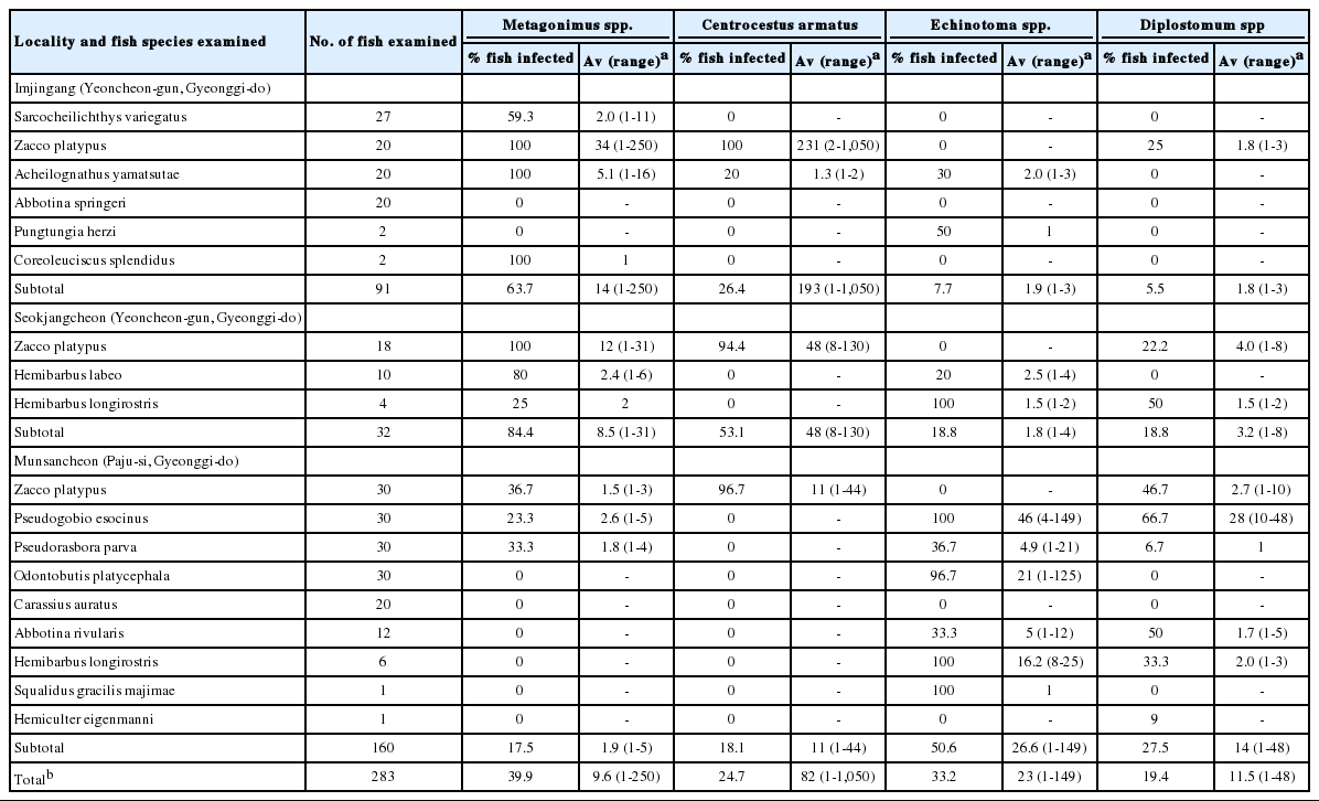 - 21. Hong SJ, Woo HC, Kim IT. Study on Centrocestus armatus in Korea. I. Infection status of Zacco platypus and Z. temminckii with the metacercariae of C. armatus. Korean J Parasitol 1989;27:41-46. (in Korean).
