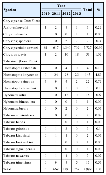 - 10. Suh SJ, Choi KS, Kwon YJ. Taxonomy of Tabanus cordiger species group (Diptera: Tabanidae) in Korea. Korean J Entomol 2003;33:1-3.