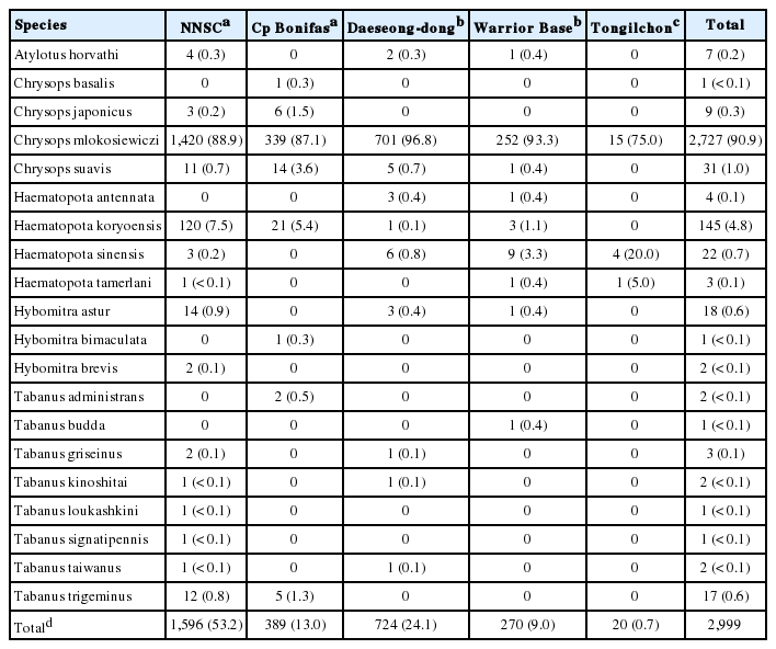 Table 3). Survey sites were divided into 3 groups by their property characteristics: NNSC and Camp Bonifas (adjacent to a low lying area and intermittent stream bordered by young mixed forests), Daeseong-dong and Warrior Base (bordered by rice paddies), and Tongilchon (adjacent to a cow shed and bordered by rice paddies and dry land agriculture on 2 sides and residences on the other 2 sides). Overall, the highest numbers (53.2%) of tabanids were collected from the NNSC camp, while the lowest numbers (0.7%) were collected at a beef farm in Tongilchon (