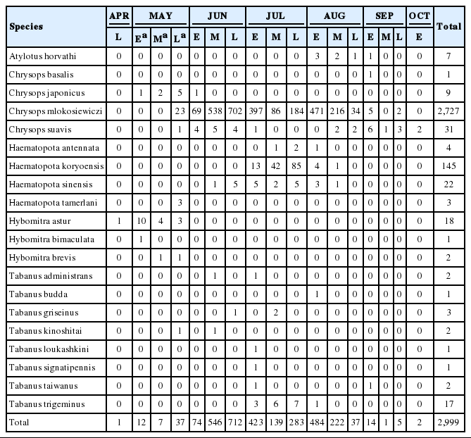 In the Republic of Korea (ROK), many systematic studies of the family Tabanidae have been recorded, but there are few observations on their seasonal activity. Kim et al. [