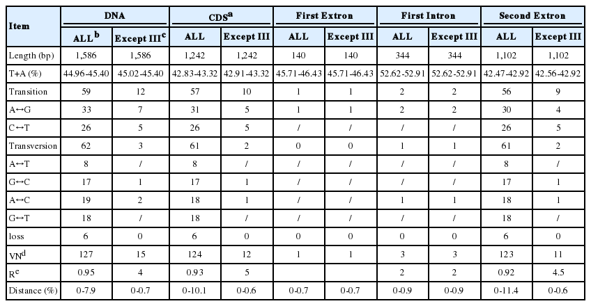Table 2). The A+T content ranged from 45.0% to 45.4% in the entire sequence. There were 124 nucleotide position variations with a distribution of 57 transitions (A↔G and C↔T), 61 transversions (C↔G, T↔G, A↔C, and A↔T) in CDS, and 2 transitions (A↔G and C↔T), and 1 transversion (C↔G, T↔G, A↔C, and A↔T) in the intron (