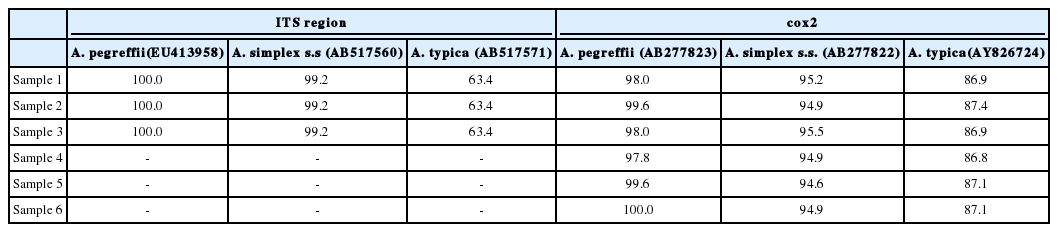 Table 1.Nucleotide identity (%) of our specimens with the known Anisakis pegreffii, A. simplex s.s. and A. typica sequences in GenBank for the ITS region and cox2