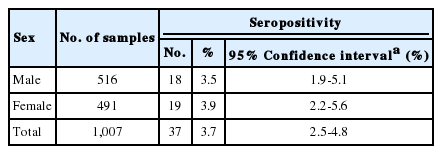 Among the total 1,007 children examined, 37 (3.7%) were positive for the specific antibody against