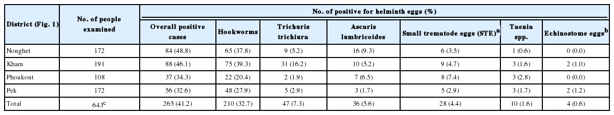 P>0.05). The highest prevalence was found in Nonghet District (48.8%) followed by Kham (46.1%), Phoukout (34.3%), and Pek Districts (32.6%). The most commonly encountered helminth eggs were those of soil-transmitted nematodes including hookworms (32.7%),