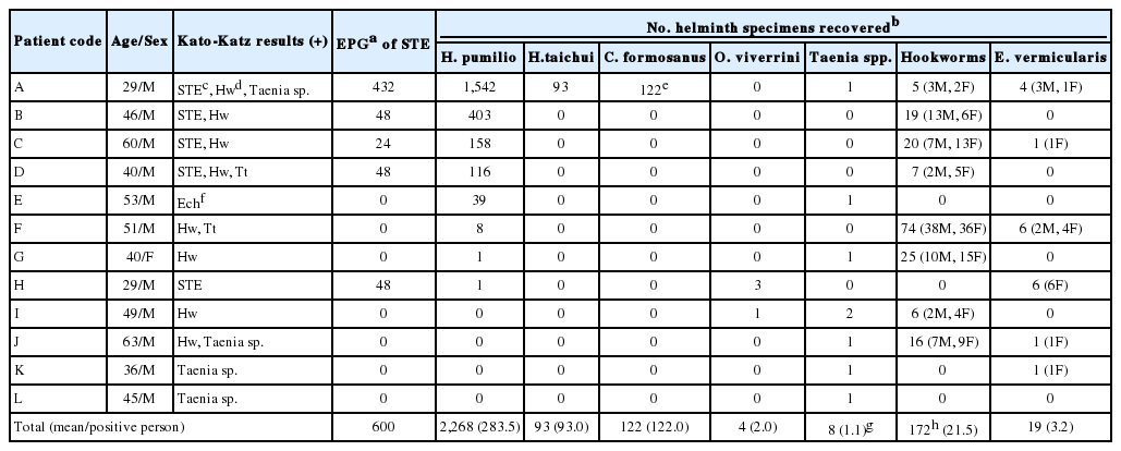 A total of 2,686 helminth specimens (2,487 trematodes, 191 nematodes, and 8 cestodes) were collected from the diarrheic stool of 12 patients (A-L) after anthelmintic treatment and purging (