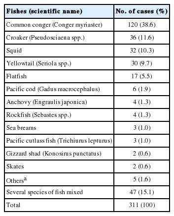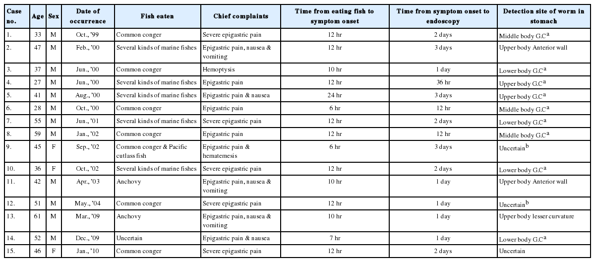 Warning: fwrite() expects parameter 1 to be resource, boolean given in /home/virtual/lib/view_data.php on line 84 Anisakiasis: Report of 15 Gastric Cases Caused by Anisakis Type I Larvae and a Brief Review of Korean Anisakiasis Cases