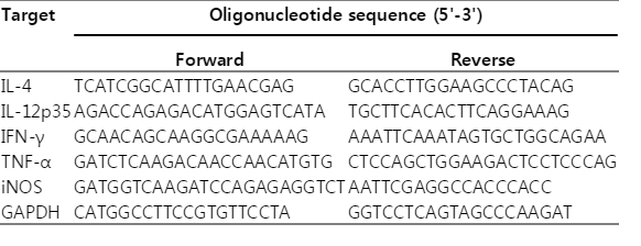 Forward Reverse IL-4 TCATCGGCATTTTGAACGAG GCACCTTGGAAGCCCTACAG IL-12p35 AGACCAGAGACATGGAGTCATA TGCTTCACACTTCAGGAAAG IFN-γ GCAACAGCAAGGCGAAAAAG AAATTCAAATAGTGCTGGCAGAA TNF-α GATCTCAAGACAACCAACATGTG CTCCAGCTGGAAGACTCCTCCCAG iNOS GATGGTCAAGATCCAGAGAGGTCT AATTCGAGGCCACCCACC GAPDH CATGGCCTTCCGTGTTCCTA GGTCCTCAGTAGCCCAAGAT