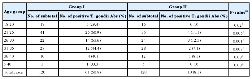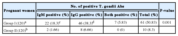 T. gondii infection in high-risk pregnancy group (group I) was 61/120 women (50.8%) vs 10/120 women (8.3%) in normal pregnancy group (group II). Seropositivity of both groups for