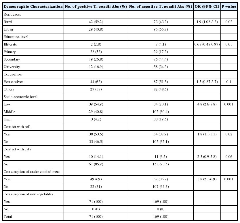 Table 5.The correlation of demographic risk factors and T. gondii seropositivity in pregnant women