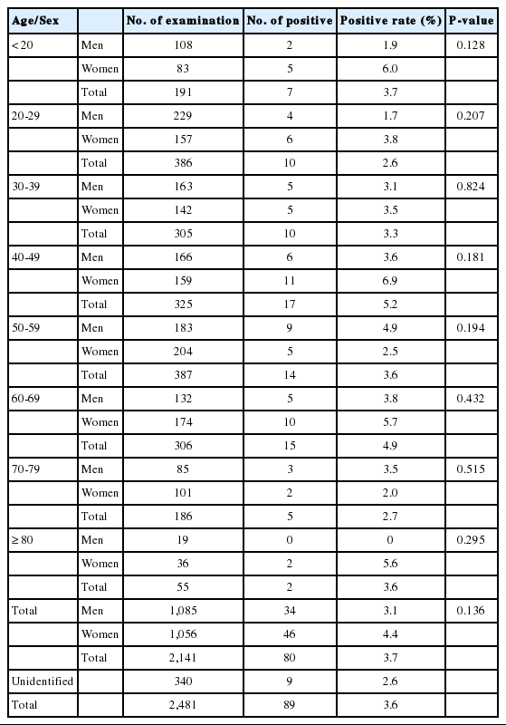 The age and sex distribution of serum antibody positive patients with other diseases are summarized in Table 3. By age, the positive rate was 5.2% (P=0.362) in 40-49 years, 4.9% (P=0.362) in 60-69 years, and 2.7% (P=0.515) in 70-79 years but all of the positive rates by age were not significant. The serum antibody positive rate was 4.4% in women and 3.1% in men, which was not statistically significant (P=0.272).