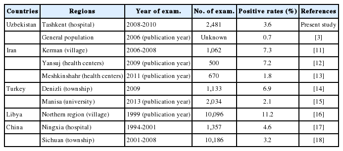 Several studies investigated serum antibody prevalence of CE in endemic countries. The antibody positive rates were described as 0.7% in Uzbekistan [3], 1.8-7.3% in Iran [11-13], 2.1-6.9% in Turkey [14,15], 11.2% in Libya [16], and 3.2-4.6% in China [17,18] (Table 4). The present positive rate of 3.6% in Tashkent, Uzbekistan is rather in low range compared to those in other endemic countries but it is higher than the previously reported rate of 0.7% in Uzbekistan. Since Tashkent is a big capital city, the present positive rate must have been lower than that in rural areas in Uzbekistan. The number of patients with CE for emergency surgery was recorded mostly in Tashkent because Tashkent is the most populous city, and the emergency hospital in Tashkent is the largest in Uzbekistan [6]. CE must be transmitted more vigorously in rural provinces than in urbanized cities because the life cycle of E. granulosus is actively maintained around sheep farms over the country. It is recommended to survey on the antibody positive rate in rural areas of Uzbekistan.