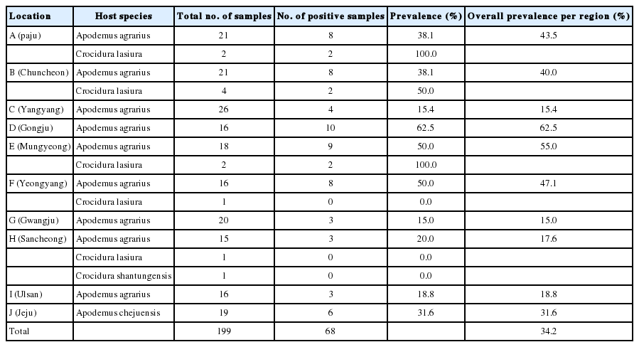 From 2012 to 2013, a total of 199 rodents and insectivores were captured with Sherman traps from 10 regions in South Korea. Each region was designated by the letters from A to J in the order of their documentation (