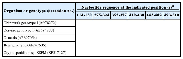 Table 2.Comparison of the nucleotide sequences of the partial 18S rRNA gene of new Cryptosporidium genotype obtained in this study (Cryptosporidium sp. KSFM) and related reference genotypes in the GenBank