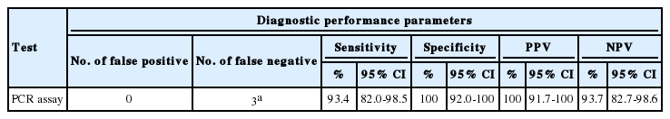 Table 2.Diagnostic performance parameters of PCR assay using 91 control fecal samples against a nominated composite gold standard test comprising microscopy, immunoassay, and a reference PCR assay