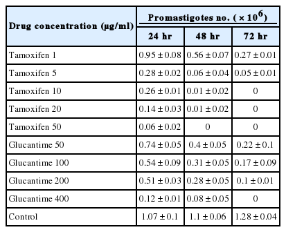 Table 1.Number (mean±SD) of promastigotes after adding tamoxifen or glucantime