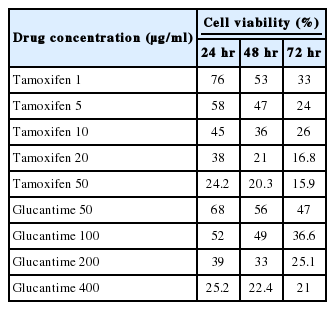 50 of tamoxifen and glucantime was 2.6 and 82.9 µg/ml, respectively, after 24 hr.