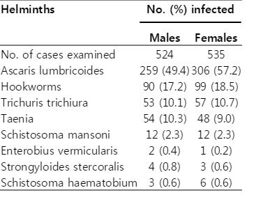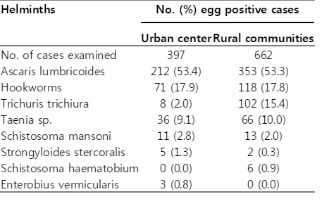 Table 1 compares the prevalences of the helminths among the urban center and the rural communities in the study area. The prevalence of