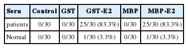 Table 1.Reactivity of recombinant GST-E2 and MBP-E2 antigens against CHIKV patients’ sera and normal sera