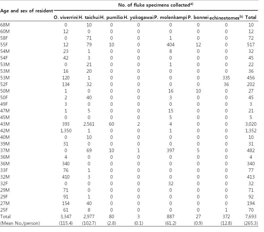 A total of 38 people who discharged small trematode eggs (opisthorchiid, heterophyid, or lecithoden driid eggs) were selected for adult fluke collection. After obtaining informed consent, these people who visited the Malaria Station were treated with a single dose (20-30 mg/kg) of praziquantel (Shinpoong Pharmaceutical Co., Seoul, Republic of Korea) and then purged with magnesium salt. Whole diarrheic stools passed successively 4-5 times were collected and pooled. Further processing of the diarrheic stools was done as previously described (