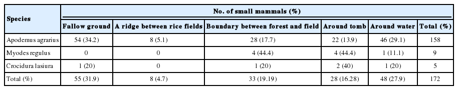 A. agrarius was higher for fallow ground (34.2%), followed by around water (29.1%), a boundary between forest and field (17.7%), around a tomb (13.9%), and a ridge between grain fields (5.1%) (