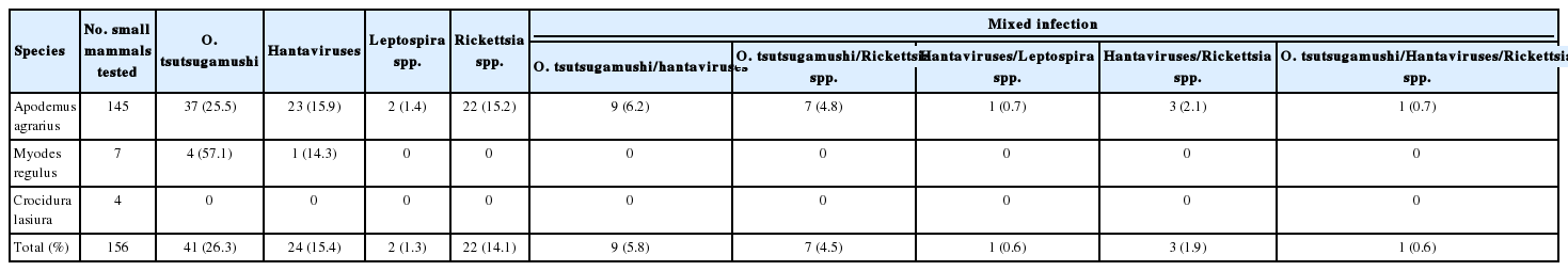 Seropositive rates for O. tsutsugamushi, hantaviruses, Rickettisia spp., and Leptospira spp. in small mammals