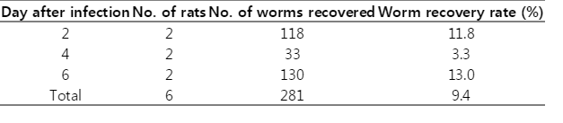 Day after infection No. of rats No. of worms recovered Worm recovery rate (%)