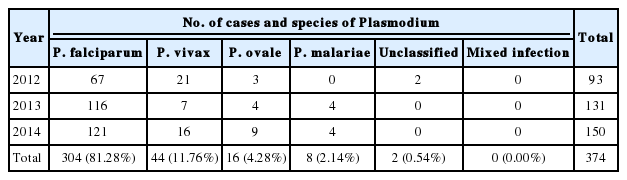 P. malariae with only 2.1% (8/374) of cases including 0 in 2012, 3.1% (4/131) in 2013, and 2.7% (4/150) in 2014. In addition, there were 2 cases in 2012 that were unable to be classified. No mixed-infection cases were identified.